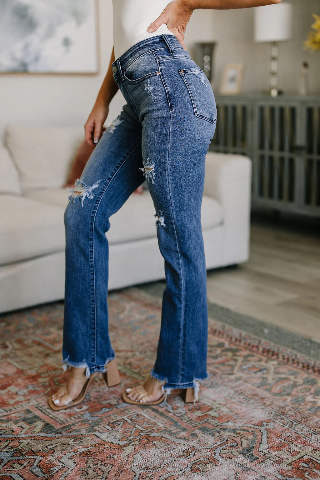 JUDY BLUE Caroline Mid Rise Control Top Distressed Flare Jeans