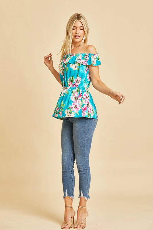 Off Shoulder Short Sleeve Top with Ruffles in Teal/Magenta